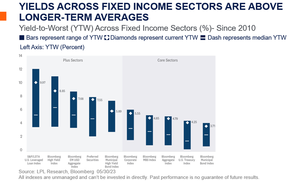 The good news for fixed income investors is now that yields are higher in most fixed income markets, investors can be selective when adding fixed income risk to portfolios. With yields for many core bond sectors still above longer-term averages [Image Below], investors don’t really need to “reach for yield” unless valuations are attractive enough to take on the additional credit risk. While there are others, the most prevalent “plus” sectors are high yield bonds, bank loans, emerging market debt, and preferred securities. We’ve generally been neutral on plus sectors, but with the recent stresses in the regional banking sector, we think a small allocation to preferred securities could be an attractive option for investors that need or want to generate additional income while index yields remain elevated.