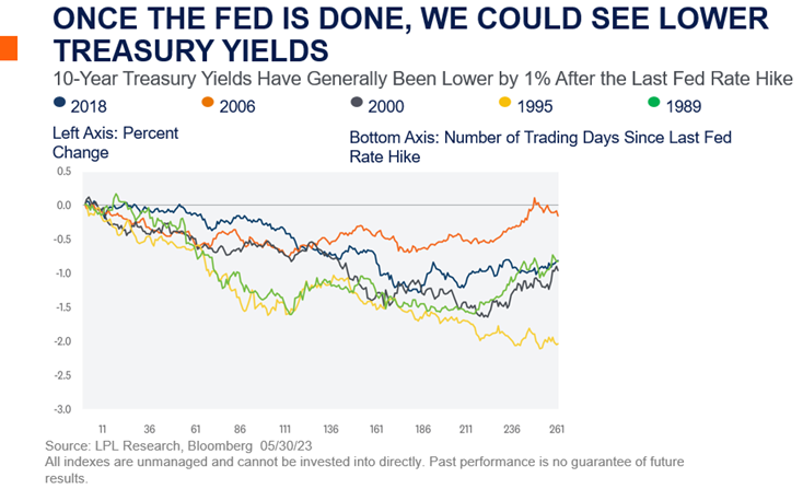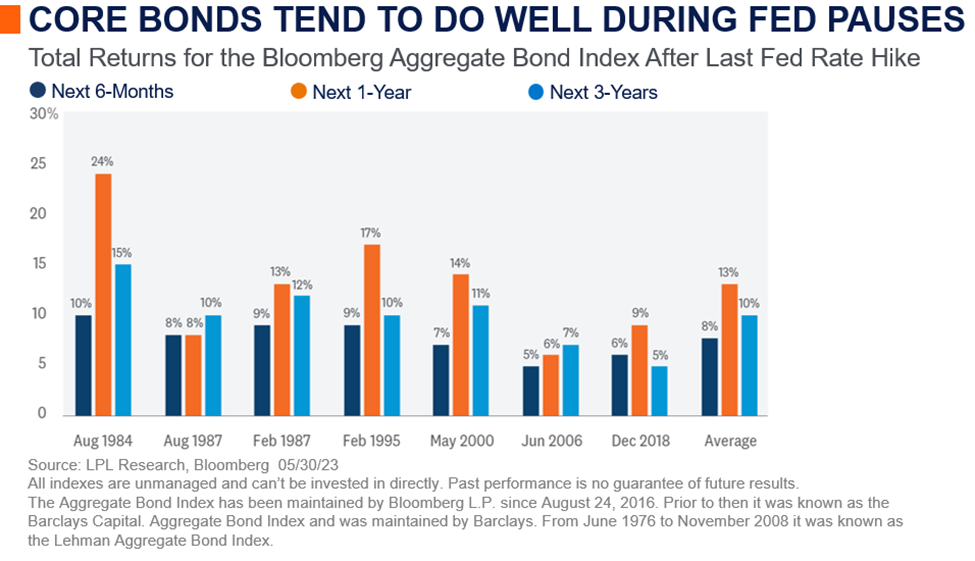 In fact, once the Fed is done raising interest rates, we could start to see lower yields on intermediate-term securities before the Fed actually cuts rates. Of the most recent Fed rate-hiking campaigns [Image Below], 10- year Treasury yields were lower, on average, by 1% after the Fed stopped raising rates. And while our base case remains a trading range for the 10-year yield between 3.25% and 3.75% throughout 2023 (similar to 2006, when the Fed kept rates at elevated levels for over a year), we acknowledge there is a strong bias for yields to end the year lower than our expectations, which could mean strong positive returns for core bonds.