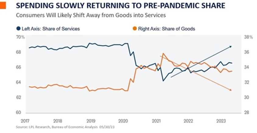 The Fed seems to be shifting to a “wait and see” strategy as the banking sector remains tenuous, consumers are slowing spending activity, and the inflation outlook looks promising for the rest of the year. It’s possible investors may not see another rate hike during this cycle. Further, banking risks seem contained and the broad financial system appears stable. We also expect consumers will have outsized demand for experiences in the remaining months of the year, offsetting the decline in goods spending as consumer spending slows while helping to mitigate a potential economic contraction. Unless economic conditions change materially, the Fed has communicated a likely July hike, whether the economy needs it or not. But as inflation convincingly cools, markets will likely respond favorably to a slight pivot in Fed policy.